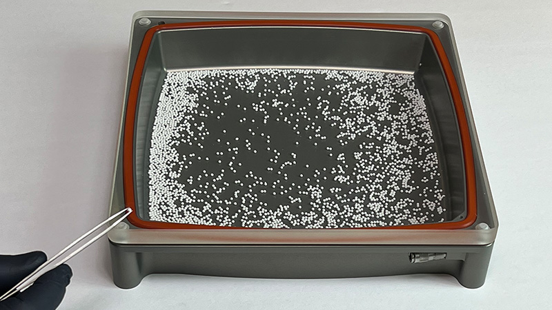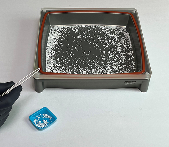 BeadLab 自动微量分发系统用于生成微珠,这些微珠被收集到冻干托盘中。一旦收集完成,托盘盖将被密封,从而实现与环境无接触地转移到冻干机中。在整个批次装载完毕并准备好冻干之前,产品将以冷冻状态保留在冻干机内。冻干完成后,托盘在真空下密封,既能将产品与外界隔离,又能保护操作人员免受潜在暴露。密封托盘既可用于长期储存,也可用于后续工艺处理。